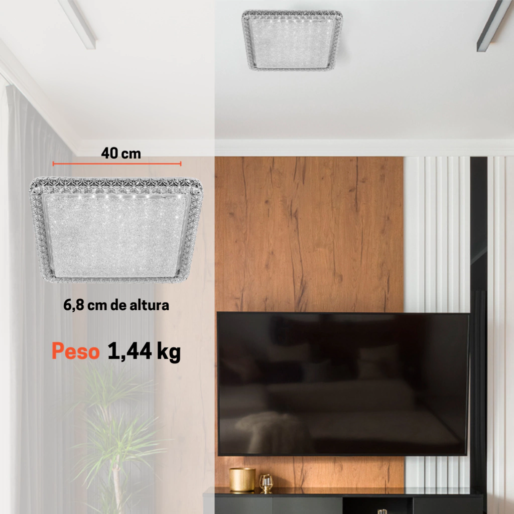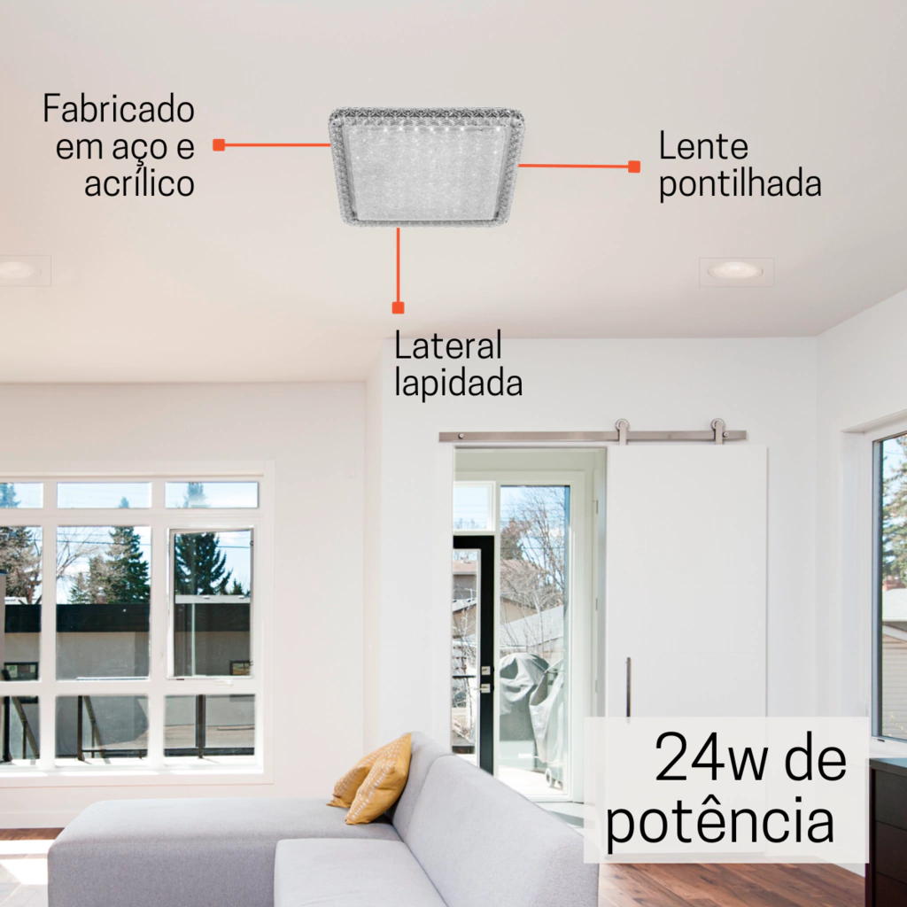 Seus detalhes no acabamento o tornam uma peça exclusiva e feita para deixar seu ambiente ainda mais bonito e aconchegante. O charme desse plafon de LED de sobrepor fica por conta da sua lateral lapidada. A lente de acrílico cristal do plafon de LED tem pequenos detalhes que dão o efeito de céu estrelado, eixando o ambiente ainda mais bonito.